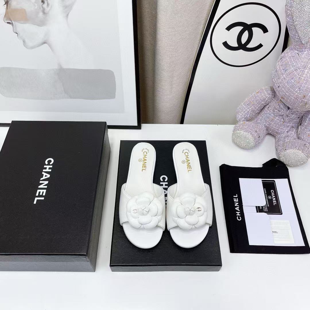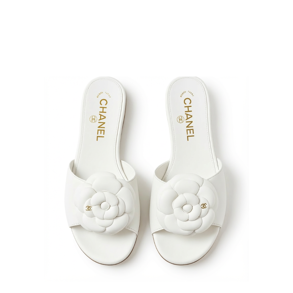 Chanel Camellia Slides White