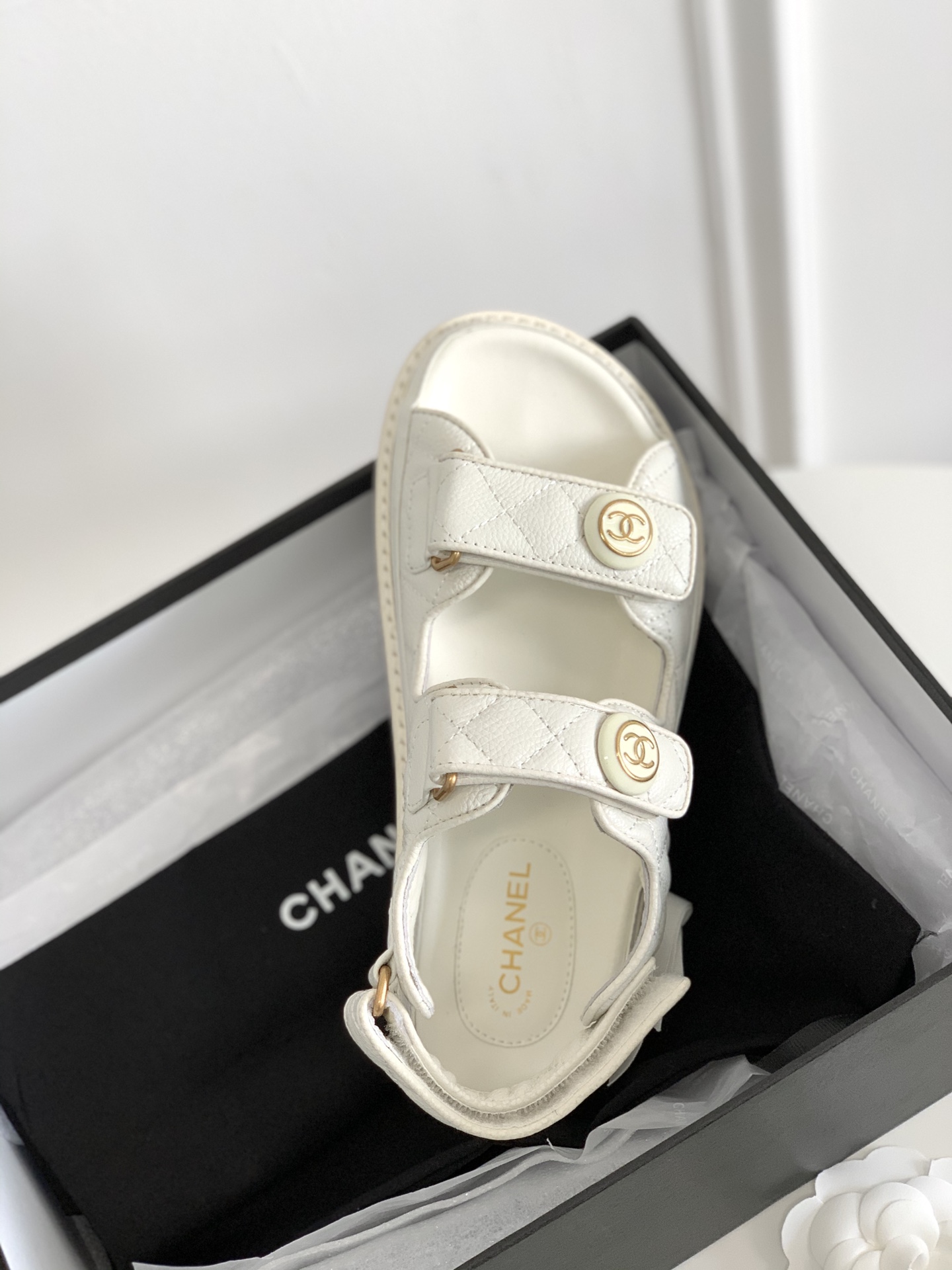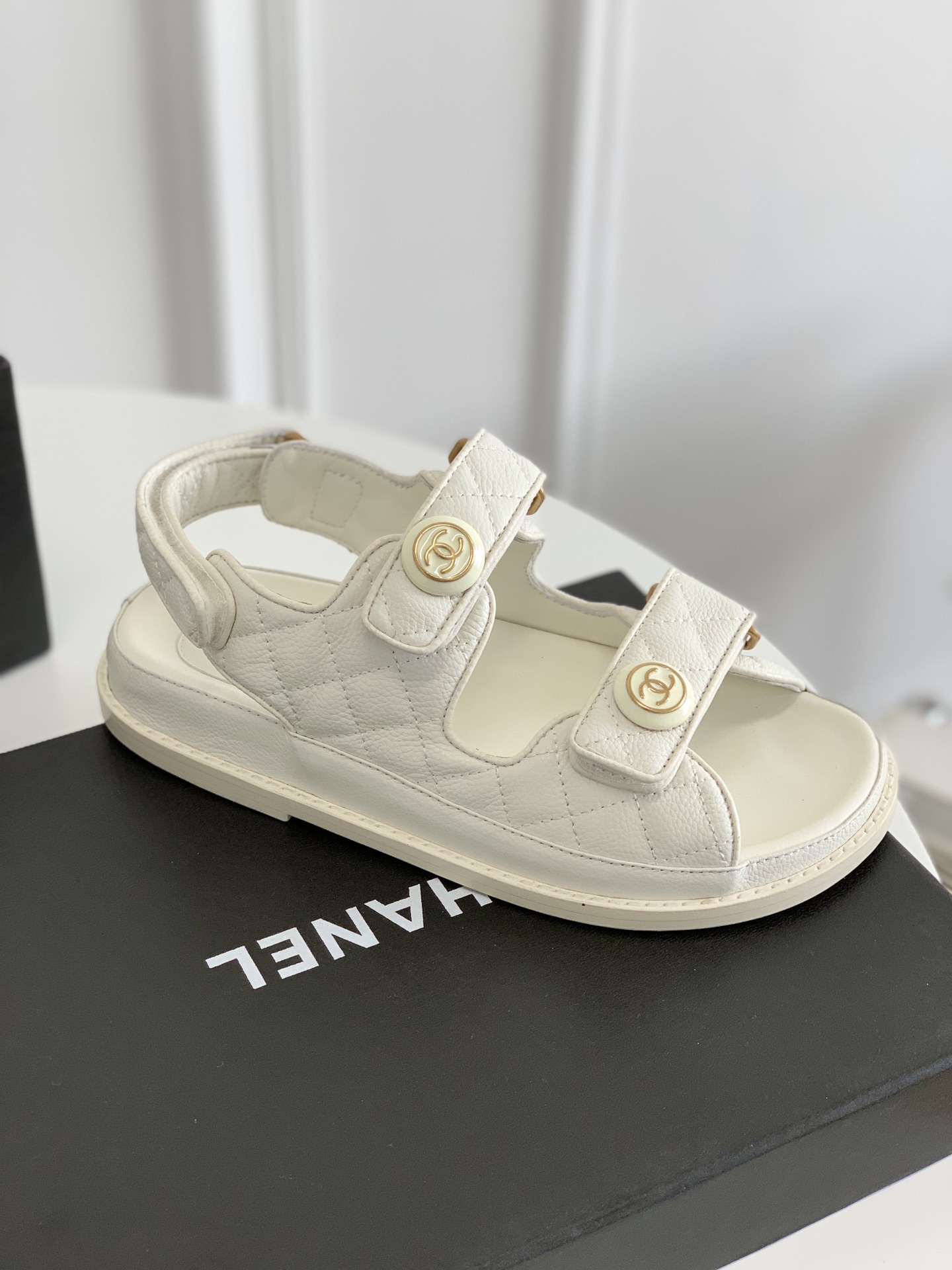Chanel Cc Button Velcro White Sandals Grained Calfskin Leather