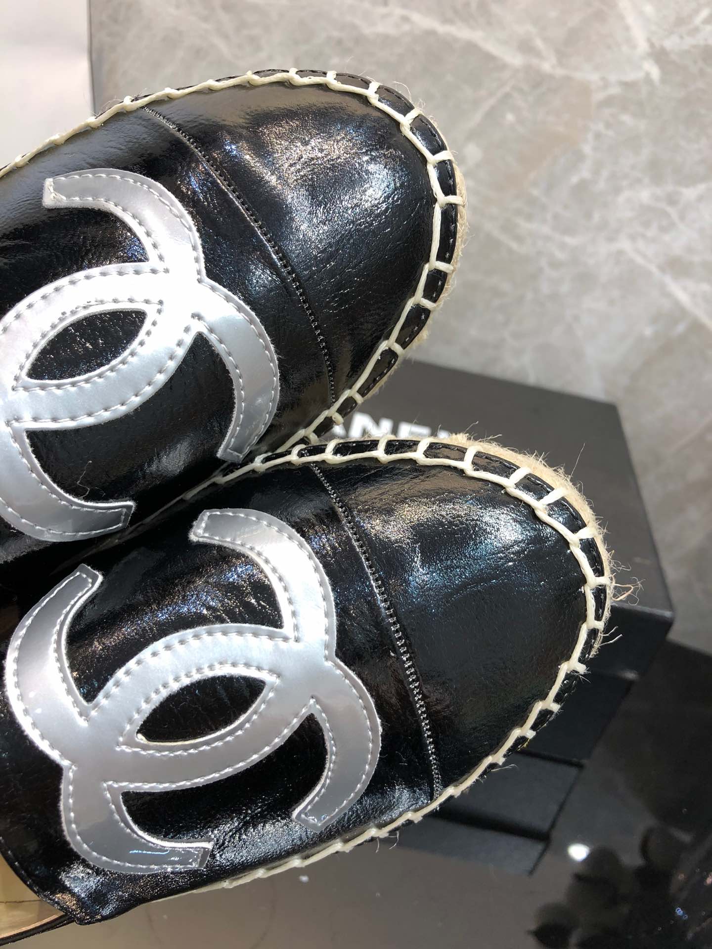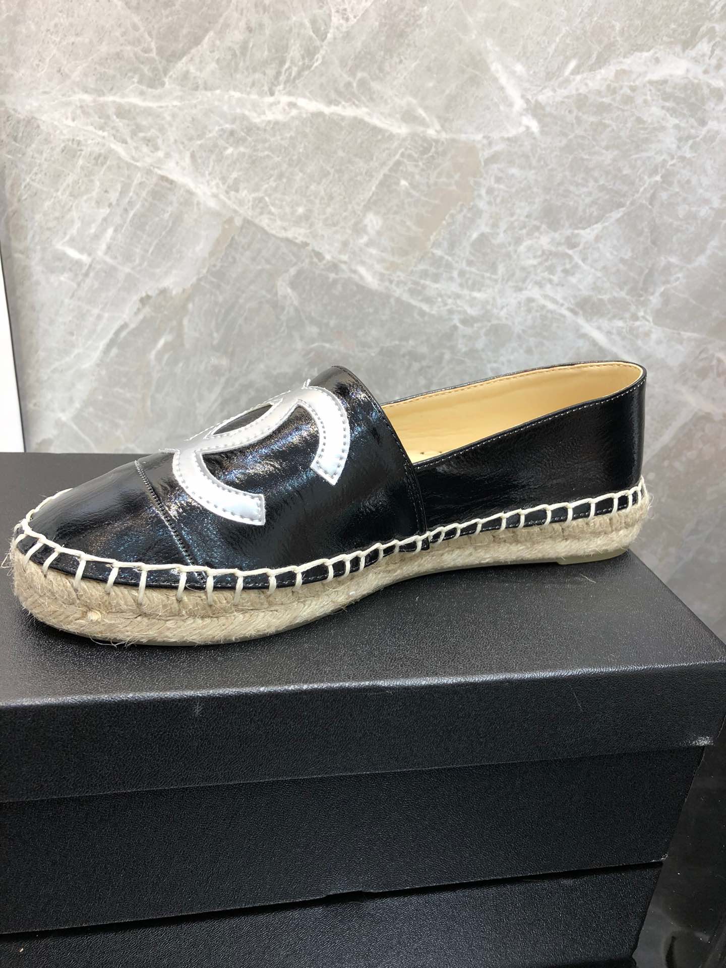 Be the first to review “Chanel Embroidered Espadrille Leather Cap Toe Flats Black Cc”