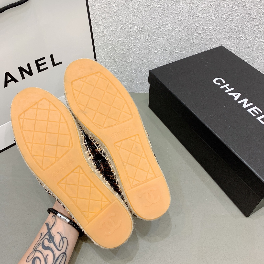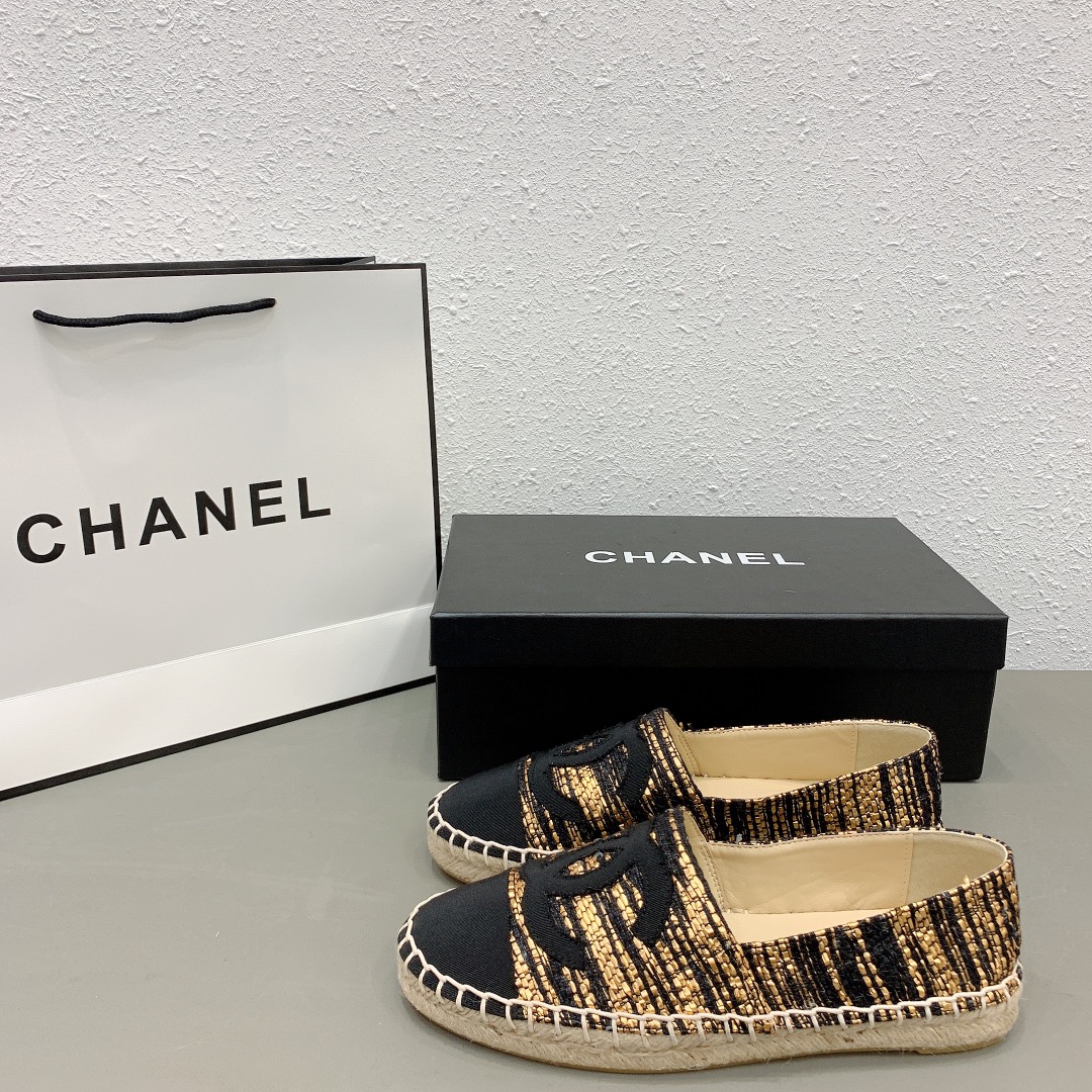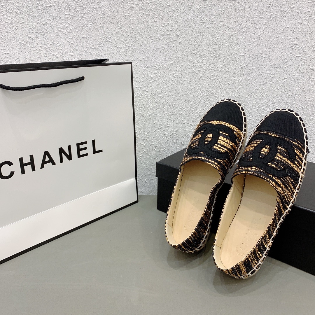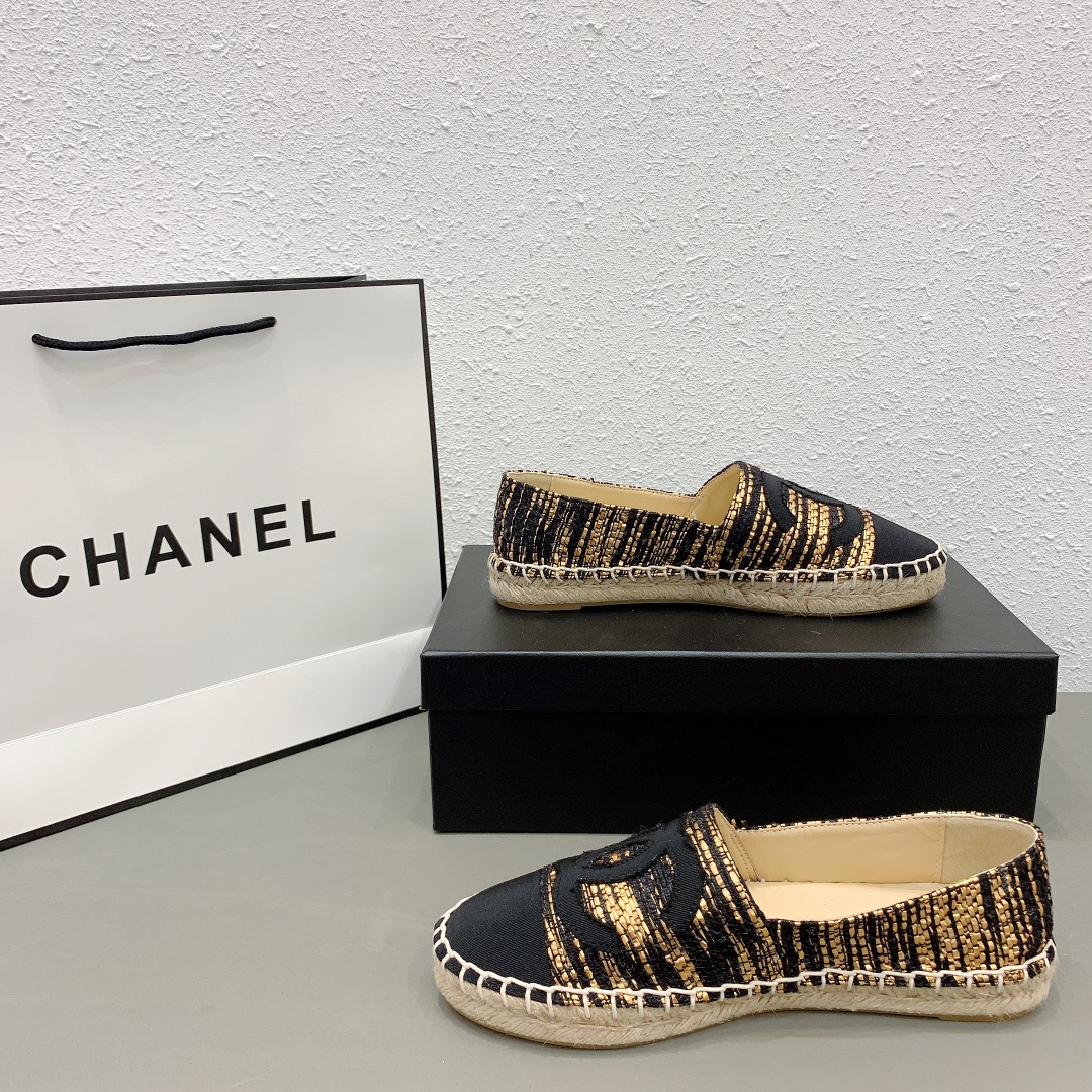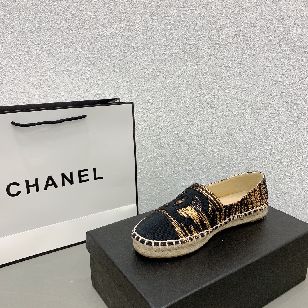 Chanel Metallic Tweed Grosgrain Cc Espadrilles Slip On Gold Black