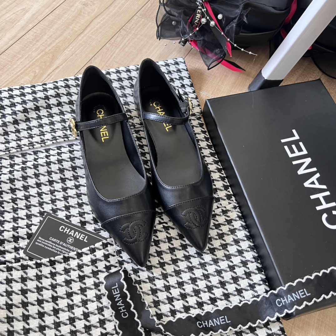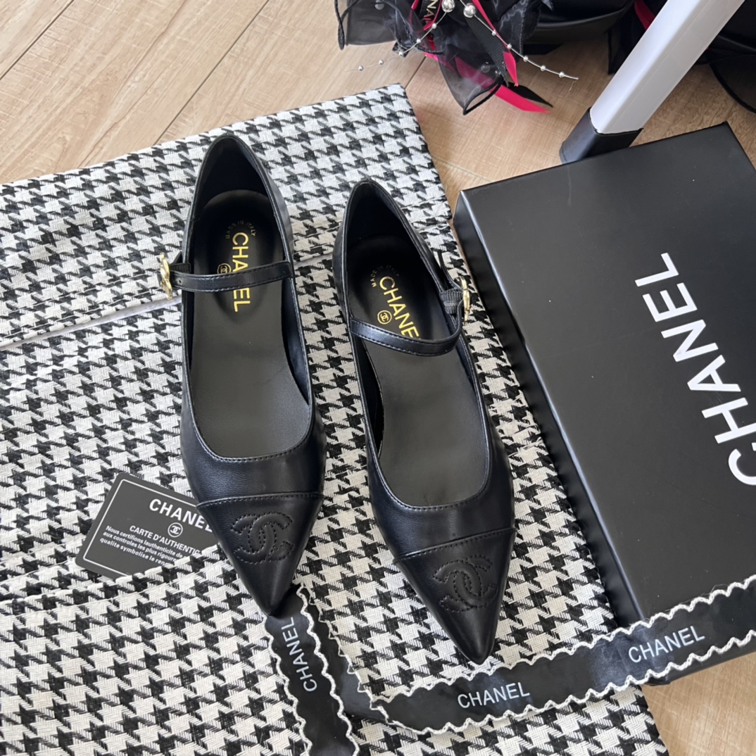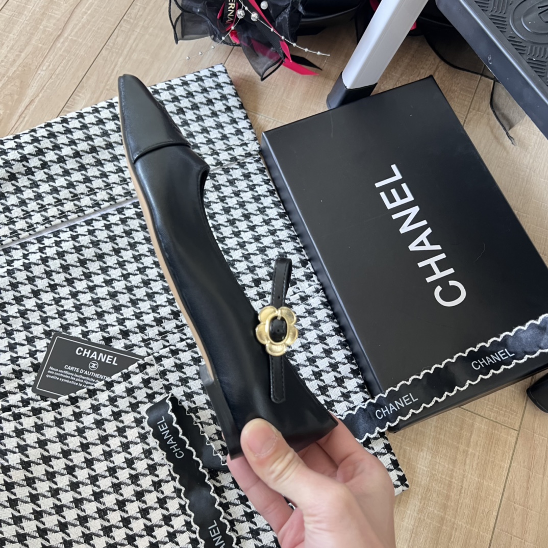 Be the first to review “Chanel Pointed Toe Doll Shoes With Gold Flower In Black”