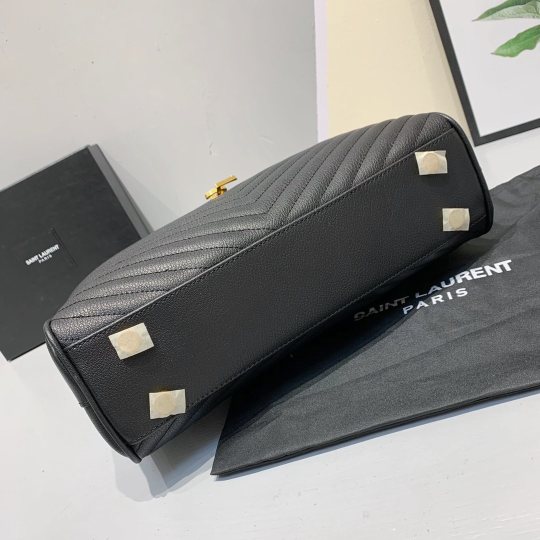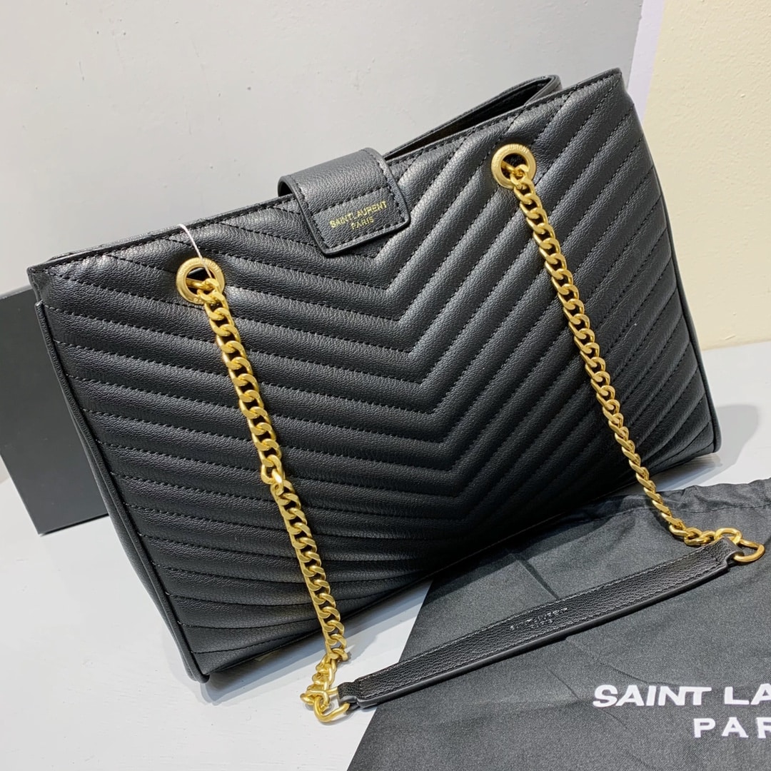 Saint Laurent Black Grain De Poudre Matelasse Chevron Monogram Shopping Bag Gold Hardware